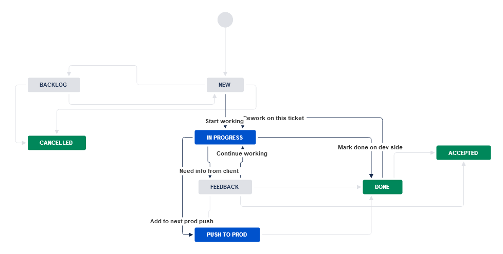 Our clients have access to the transition between NEW, BACKLOG and CANCELLED states and is also exclusively permitted to accept a DONE ticket at consultant’s end. What’s more, we can also configure automation to switch a FEEDBACK ticket to IN PROGRESS whenever a client replies – going perfect with our business workflow.